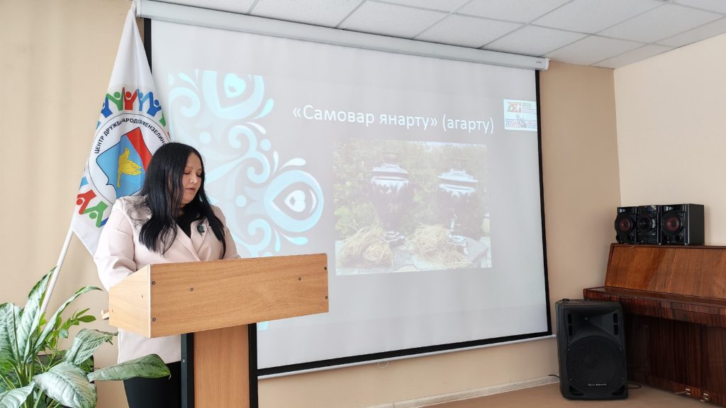 Директор Верхнетакерменского сельского Дома культуры Алина Якиева выступила с докладом об объектах нематериального этнокультурного достояния и в качестве примера ознакомила с обрядом «Самовар яңарту» («Чистка самовара»).